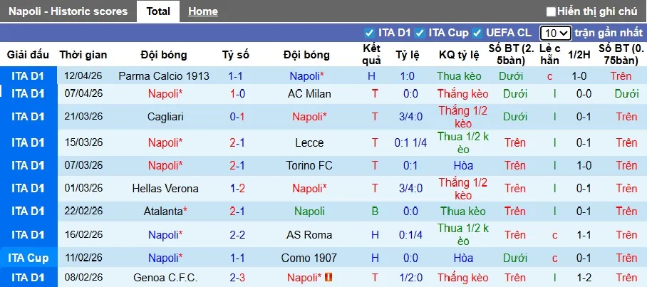 Thống kê phong độ 10 trận đấu gần nhất của Napoli