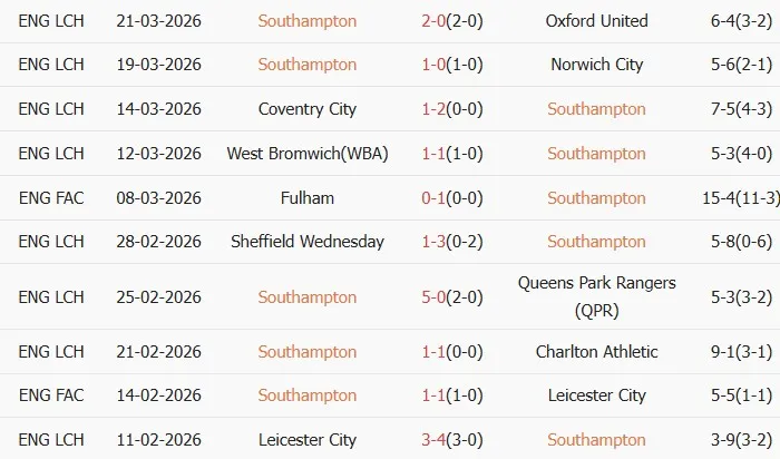 Thống kê phong độ 10 trận đấu gần nhất của Southampton