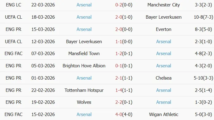 Thống kê phong độ 10 trận đấu gần nhất của Arsenal