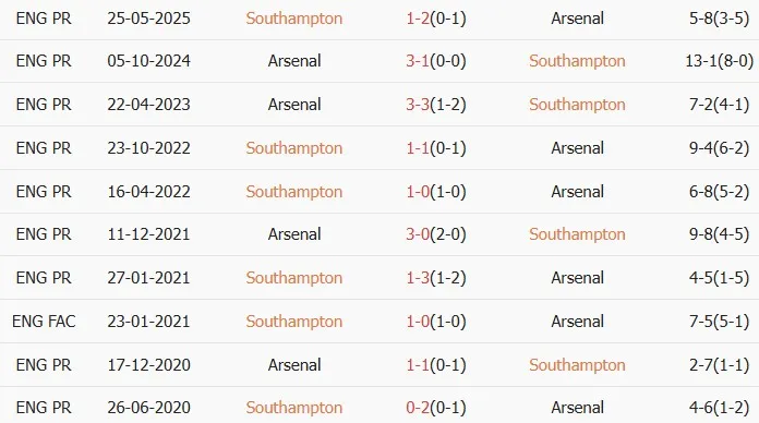Lịch sử đối đầu Southampton vs Arsenal