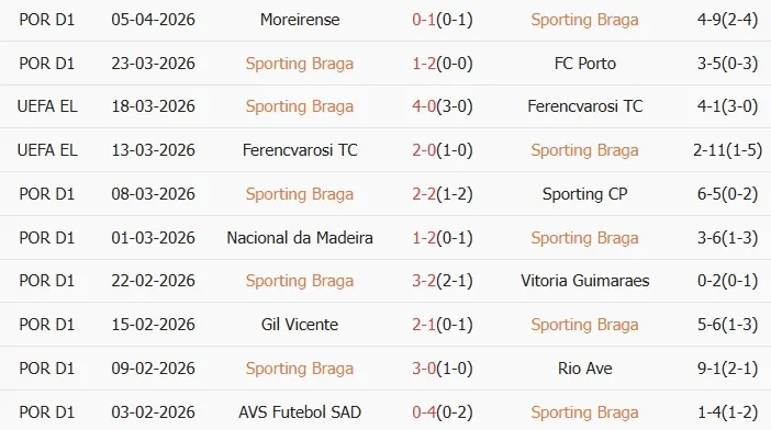 Thống kê phong độ 10 trận đấu gần nhất của Braga