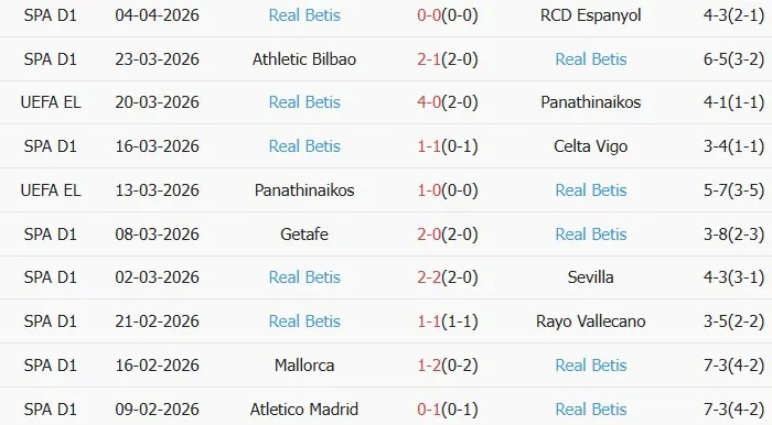 Thống kê phong độ 10 trận đấu gần nhất của Real Betis