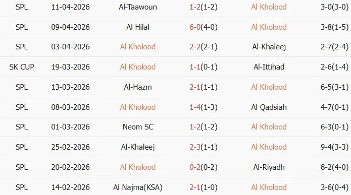 Thống kê phong độ 10 trận đấu gần nhất của Al-Kholood cho thấy sự ổn định và tiến bộ của đội.
