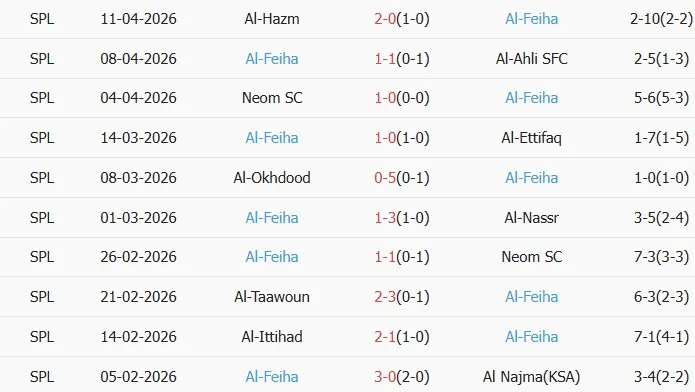 Thống kê phong độ 10 trận đấu gần nhất của Al-Fayha cho thấy sự bất ổn và khó khăn của đội.