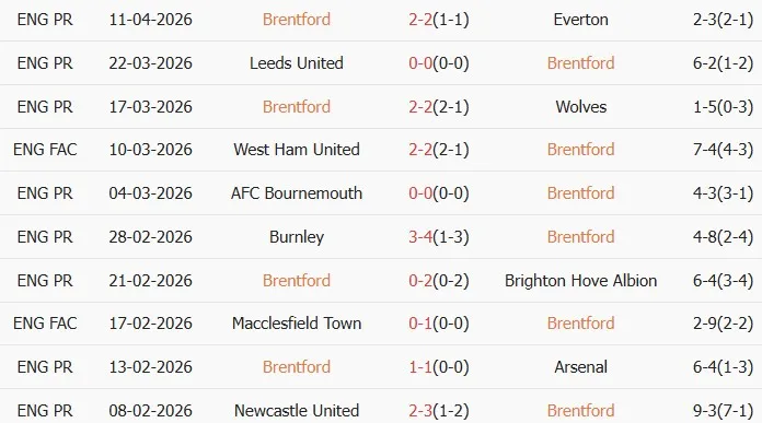 Dưới đây là thống kê phong độ 10 trận đấu gần nhất của Brentford, giúp chúng ta có cái nhìn sâu sắc hơn về phong độ hiện tại của đội.