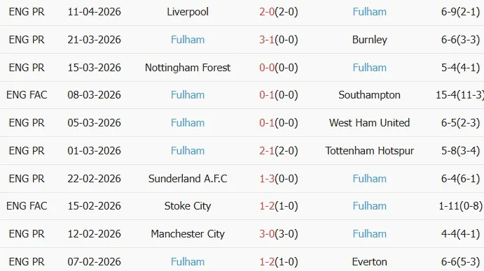 Chúng ta cũng có thống kê phong độ 10 trận đấu gần nhất của Fulham, giúp so sánh phong độ của hai đội.