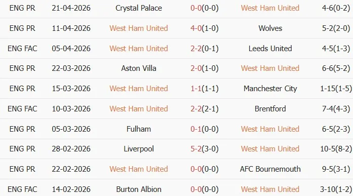 Thống kê phong độ 10 trận đấu gần nhất của West Ham