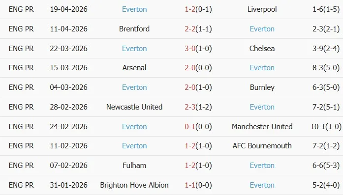 Thống kê phong độ 10 trận đấu gần nhất của Everton