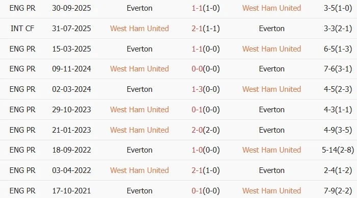 Thống kê phong độ, lịch sử đối đầu của West Ham vs Everton