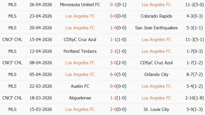 Thống kê phong độ 10 trận đấu gần nhất của Los Angeles