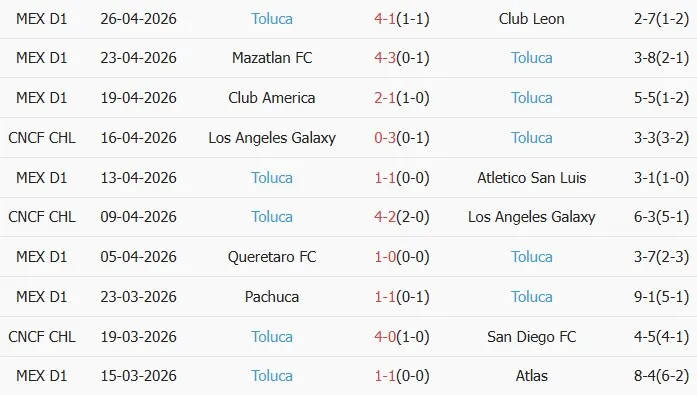 Thống kê phong độ 10 trận đấu gần nhất của Toluca