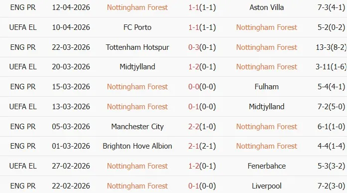 Thống kê phong độ 10 trận đấu gần nhất của Nottingham