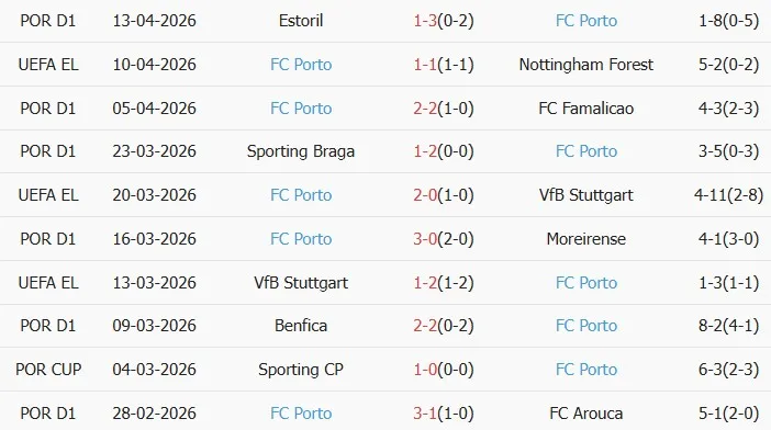 Thống kê phong độ 10 trận đấu gần nhất của Porto