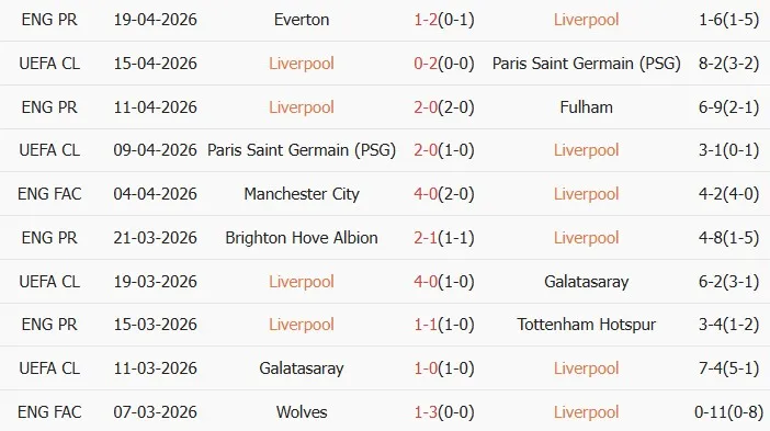 Thống kê phong độ 10 trận đấu gần nhất của Liverpool