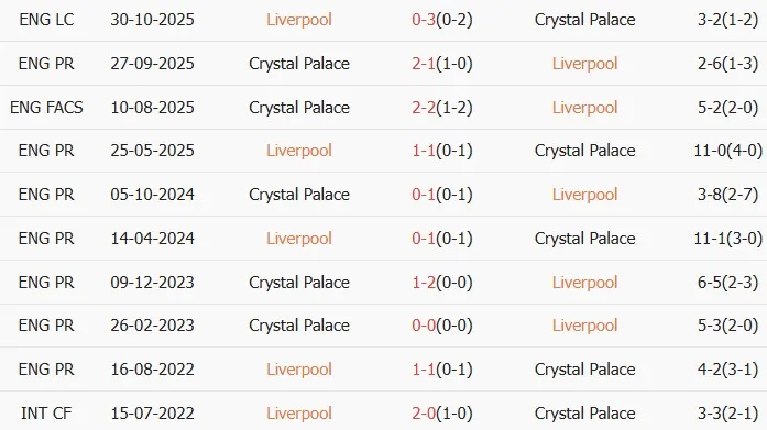 Lịch sử đối đầu Liverpool vs Crystal Palace