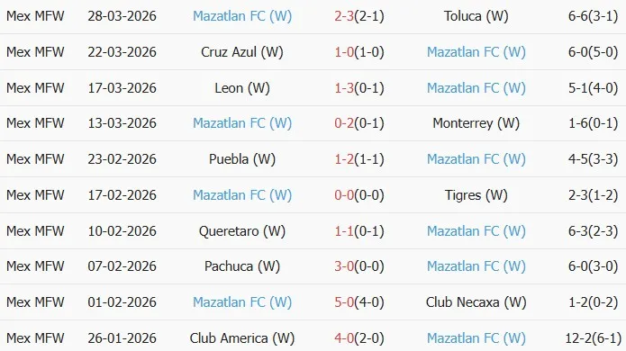 Thống kê phong độ 10 trận đấu gần nhất của Nữ Mazatlan