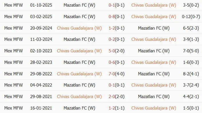 Lịch sử đối đầu Nữ Guadalajara vs Nữ Mazatlan