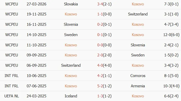 Thống kê phong độ 10 trận đấu gần nhất của Kosovo