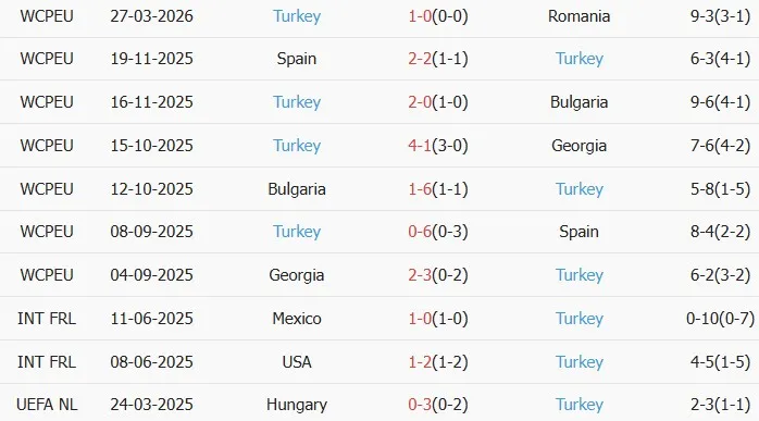 Thống kê phong độ 10 trận đấu gần nhất của Thổ Nhĩ Kỳ