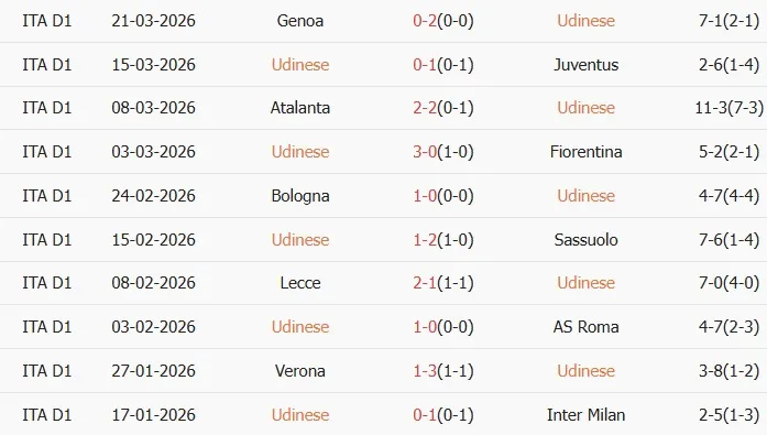 Thống kê phong độ 10 trận đấu gần nhất của Udinese