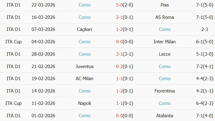 Thống kê phong độ 10 trận đấu gần nhất của Como
