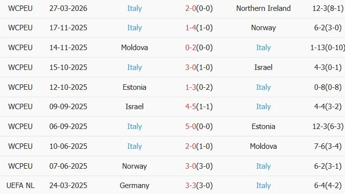 Thống kê phong độ 10 trận đấu gần nhất của Italia