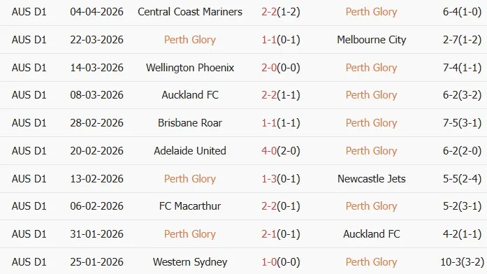 Thống kê phong độ 10 trận đấu gần nhất của Perth Glory