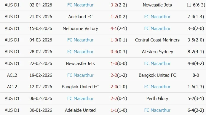 Thống kê phong độ 10 trận đấu gần nhất của Macarthur