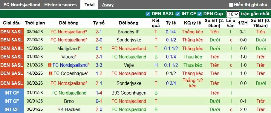 Thống kê phong độ 10 trận đấu gần nhất của Nordsjaelland