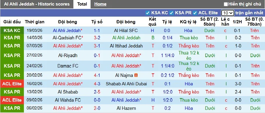 Thống kê phong độ 10 trận đấu gần nhất của Al-Ahli
