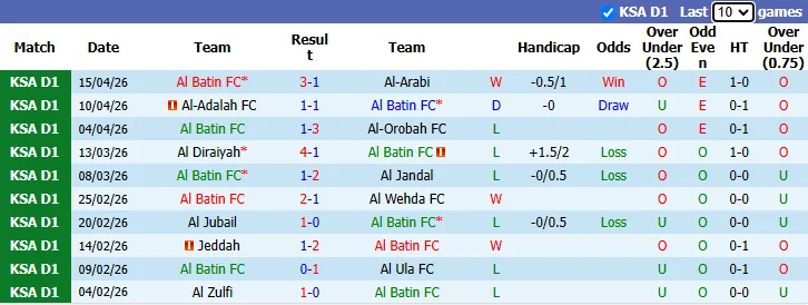 Thống kê phong độ 10 trận gần nhất của Al Batin