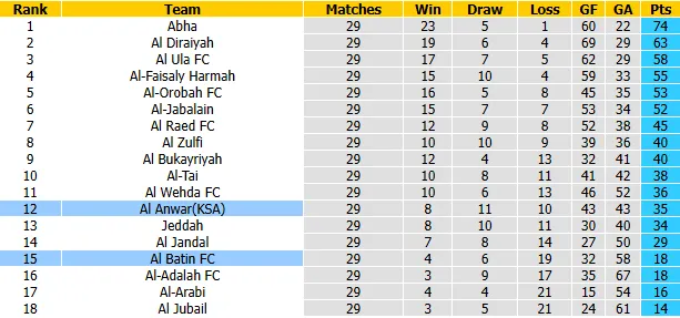 Hàng thủ của đội bóng áo xanh đang là vấn đề nhức nhối khi để thủng lưới tới 58 bàn (trung bình 2 bàn/trận). Với khoảng cách lên tới 11 điểm so với nhóm an toàn, mỗi trận đấu còn lại đối với Al Batin đều là một trận chung kết không được phép sai lầm.