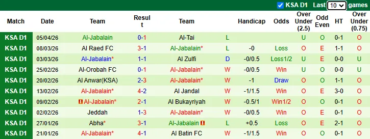 Thống kê phong độ 10 trận gần nhất của Al-Jabalain