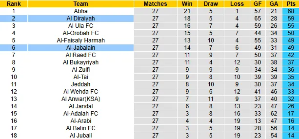 Al Diraiyah đang sở hữu hàng công mạnh nhất giải đấu với 65 bàn thắng sau 27 trận (trung bình 2.41 bàn/trận). Phong độ của Al Diraiyah là vô cùng khủng khiếp khi thắng 4/5 trận gần nhất và ghi bàn liên tiếp trong 16 trận đấu vừa qua. Đặc biệt, trên sân nhà, họ vừa có những chiến thắng hủy diệt như 4-1 trước Al Baten hay 5-0 trước Al Wahda Mecca.