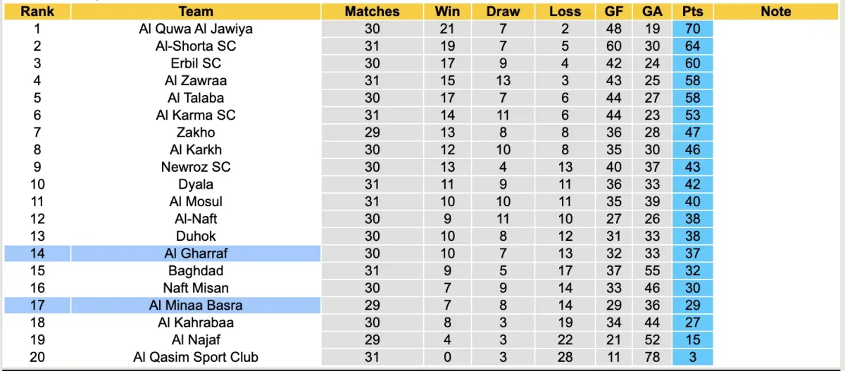 Bảng xếp hạng bóng đá Giải VĐQG Iraq 2026