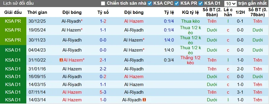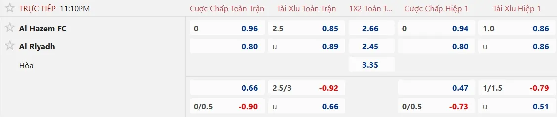 Al Hazem bước vào trận đấu này với mạch 3 trận liên tiếp thắng kèo châu Á. Nếu tính xa hơn, đội chủ nhà thắng kèo châu Á 5/7 trận đấu vừa qua, trong đó có 1 trận cũng xuất hiện kèo châu Á 0:0 như trận đấu này. Với Al-Riyadh, đội khách thua kèo châu Á 2/3 trận xa nhà vừa qua.