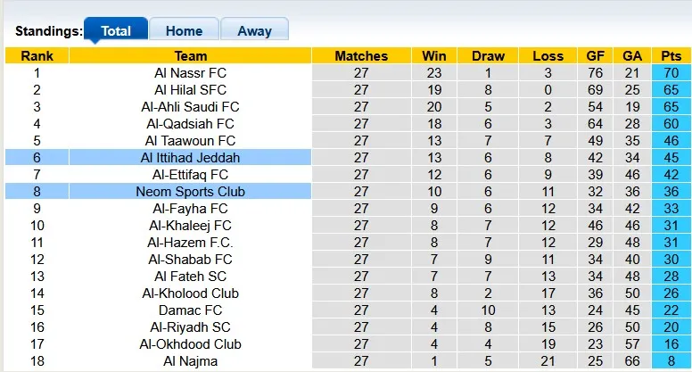 Neom là một tân binh của giải VĐQG Saudi Arabia ở mùa giải này. Họ đã chơi rất tốt. Trong bối cảnh hiện tại khi đã chính thức trụ hạng thành công, đội khách hoàn toàn thoải mái tâm lý và có thể gây ra bất ngờ ở vòng đấu này.