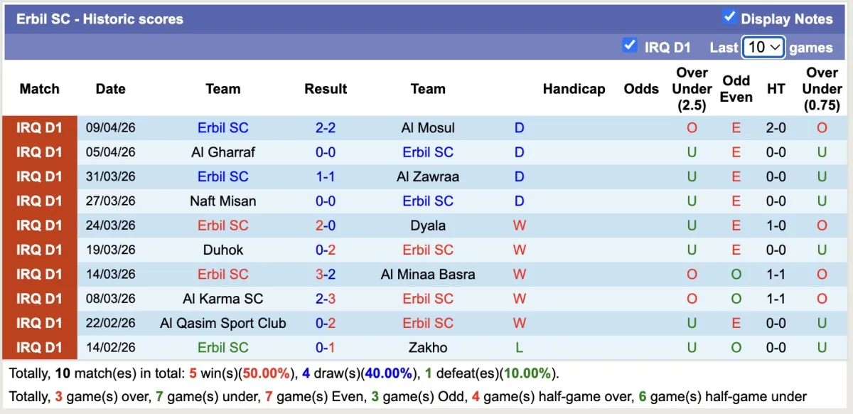 -Thống kê phong độ 10 trận đấu gần nhất của Erbil