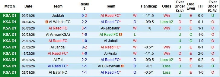 Thống kê phong độ 10 trận đấu gần nhất của Al Raed