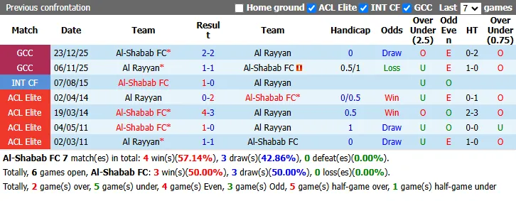 Lịch sử đối đầu Al-Shabab vs Al Rayyan