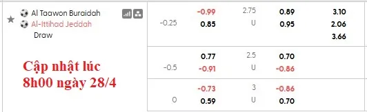 Al Ittihad từ đầu mùa có tỷ lệ thắng kèo rất thấp, chỉ 6/28 trận, ít hơn tất cả các đội còn lại tại Pro League. Trong khi đó, Al Taawoun lại có đến 16 trận thắng kèo, đứng thứ 3. Mức chấp 1/4 rõ ràng thiếu tin cậy với các nhà ĐKVĐ.