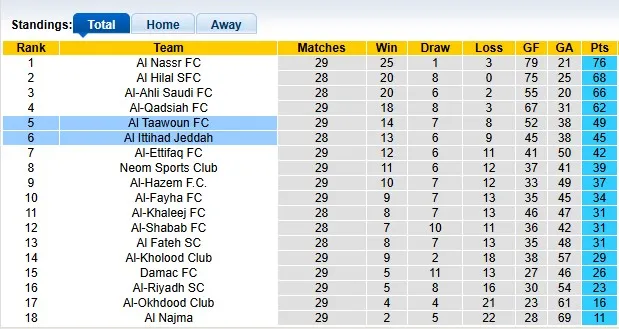 Trận đấu này với Al Taawoun sẽ rất quan trọng, thậm chí như trận chung kết của mùa giải khi đối thủ của họ chính là Al Ittihad – đối thủ trực tiếp cạnh tranh vị trí thứ 5. Al Ittihad kém 4 điểm, nhưng lại chơi ít hơn đối phương 1 trận.