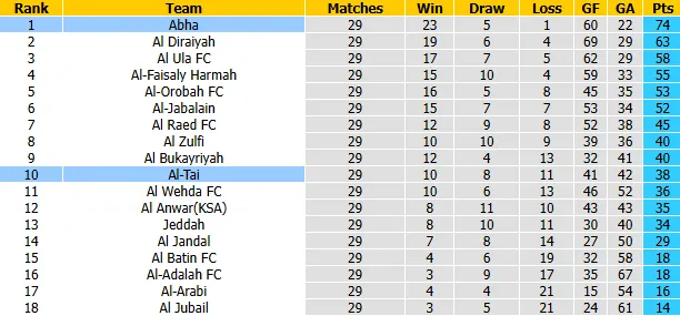 Al-Tai hiện đang đứng ở vị trí thứ 10 với 38 điểm sau 29 trận. Phong độ gần đây của đội chủ sân Prince Abdul Aziz bin Masaad là khá bất ổn khi thắng 2, hòa 1 và thua 2 trong 5 vòng đấu gần nhất. Điểm yếu lớn nhất của Al-Tai nằm ở hàng phòng ngự khi họ liên tục để thủng lưới trước những đối thủ có hàng công mạnh.
