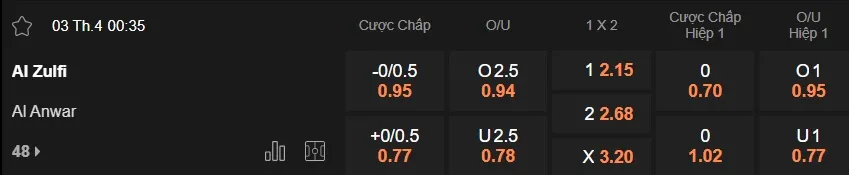 Sàn giao dịch châu Á ghi nhận mức kèo Al Zulfi chấp 1/4 trái, tỷ lệ mà đội chủ nhà khá có duyên, khi 3 trận gần đây xuất hiện họ đều là đội giành chiến thắng. Với Al Anwar, trận đấu gần nhất được chấp 1/4 trái như trận này họ nhận trái đắng.