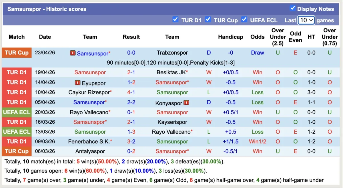 -Thống kê phong độ 10 trận đấu gần nhất của Samsunspor