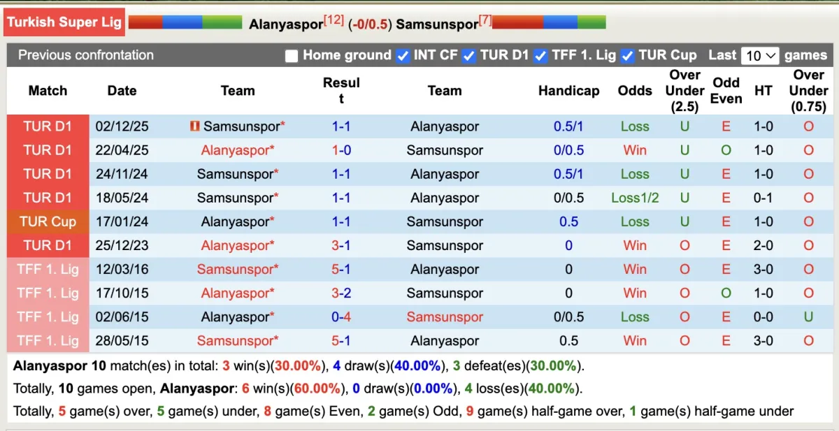 Thống kê phong độ, lịch sử đối đầu của Alanyaspor với Samsunspor