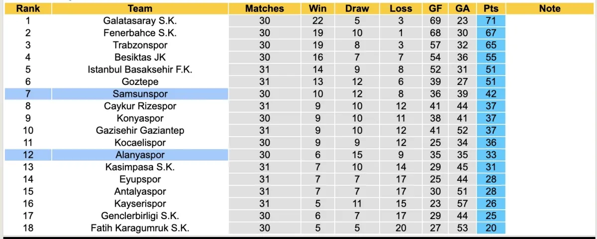 Ở giải VĐQG Thổ Nhĩ Kỳ, Samsunspor hiện tại đang đứng thứ 7 với 42 điểm sau 30 vòng đấu. Với việc mùa giải còn 4 trận nữa kết thúc. Có lẽ mọi chuyện đã chấm dứt với đội khách khi họ kém nhóm dự Cup châu Âu đến 13 điểm.