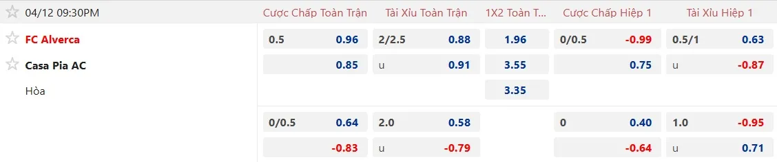Sàn giao dịch châu Á ghi nhận mức kèo Alverca chấp 1/4 trái, tỷ lệ đã xuất hiện ở trận đấu gần đây của họ, khi đánh bại Rio Ave cuối tuần trước. Tính xa hơn, 3 trận đấu từ đầu mùa giải mà Alverca chấp 1/4 trái họ đều là những người giành chiến thắng. Với Casa Pia, 4 trận sân khách gần nhất được chấp 1/4 trái họ để thua kèo tới 3 trận.
