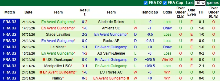 Thống kê phong độ 10 trận gần nhất của Guingamp