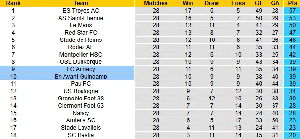 Annecy đang cho thấy dấu hiệu hụt hơi trong giai đoạn nước rút. Trước quãng nghỉ, họ đã phải nhận 3 thất bại liên tiếp trước những đội bóng nhóm đầu, khiến hy vọng bám đuổi Top 5 gần như tan biến. Tuy nhiên, sân nhà Parc des Sports vẫn là điểm tựa tinh thần quan trọng với Annecy.